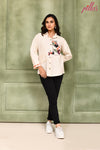 A charming cream-colored button-down shirt with a relaxed fit, featuring a whimsical floral-embroidered cat silhouette and delicate floral details on the cuffs.