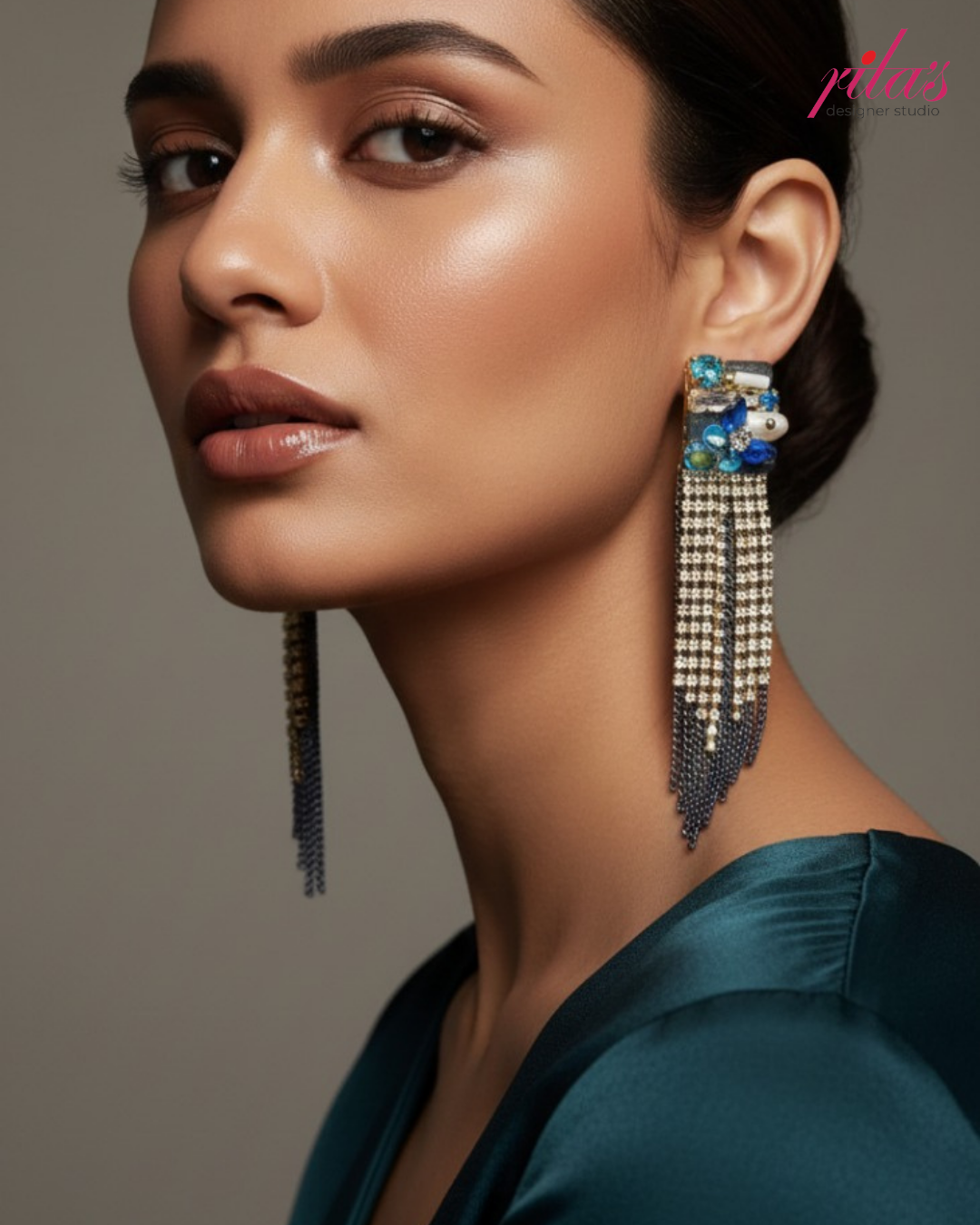 Bold architectural earrings featuring a rectangular cluster of vibrant blue stones and pearls paired with a long, structured drape of metallic chain fringe.