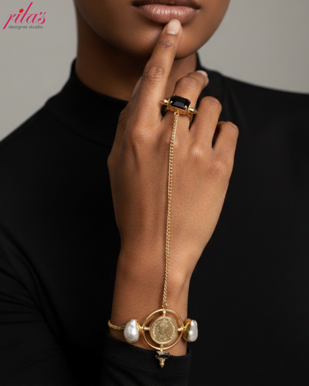 A gold-tone hand harness with a square black stone ring connected to a bracelet featuring a central gold coin and white pearl accents.