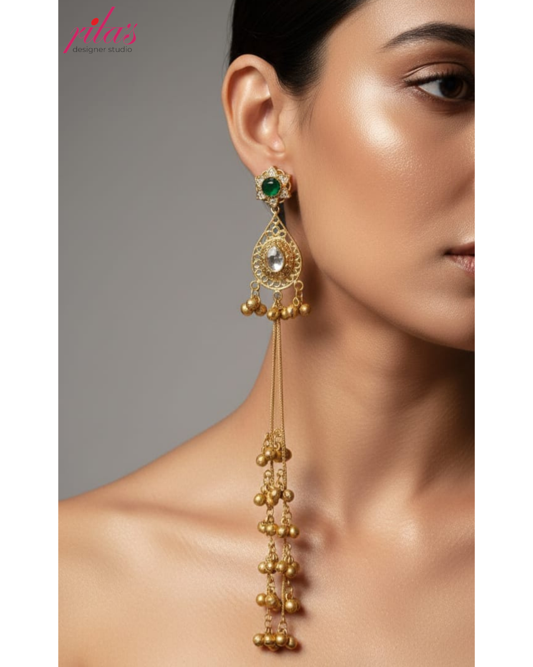 This elegant long-drop earring features an intricate gold filigree teardrop design accented with a green gemstone stud and a clear center stone, finished with multiple tiered cascading gold beads.