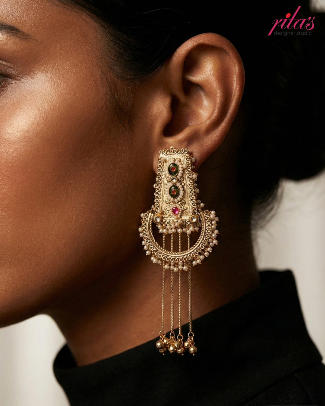 This ornate, gold-toned statement earring from Rita’s Designer Studio features a Kundan-style medallion with colorful stone inlays and a long, tiered cascade of delicate gold chain tassels.