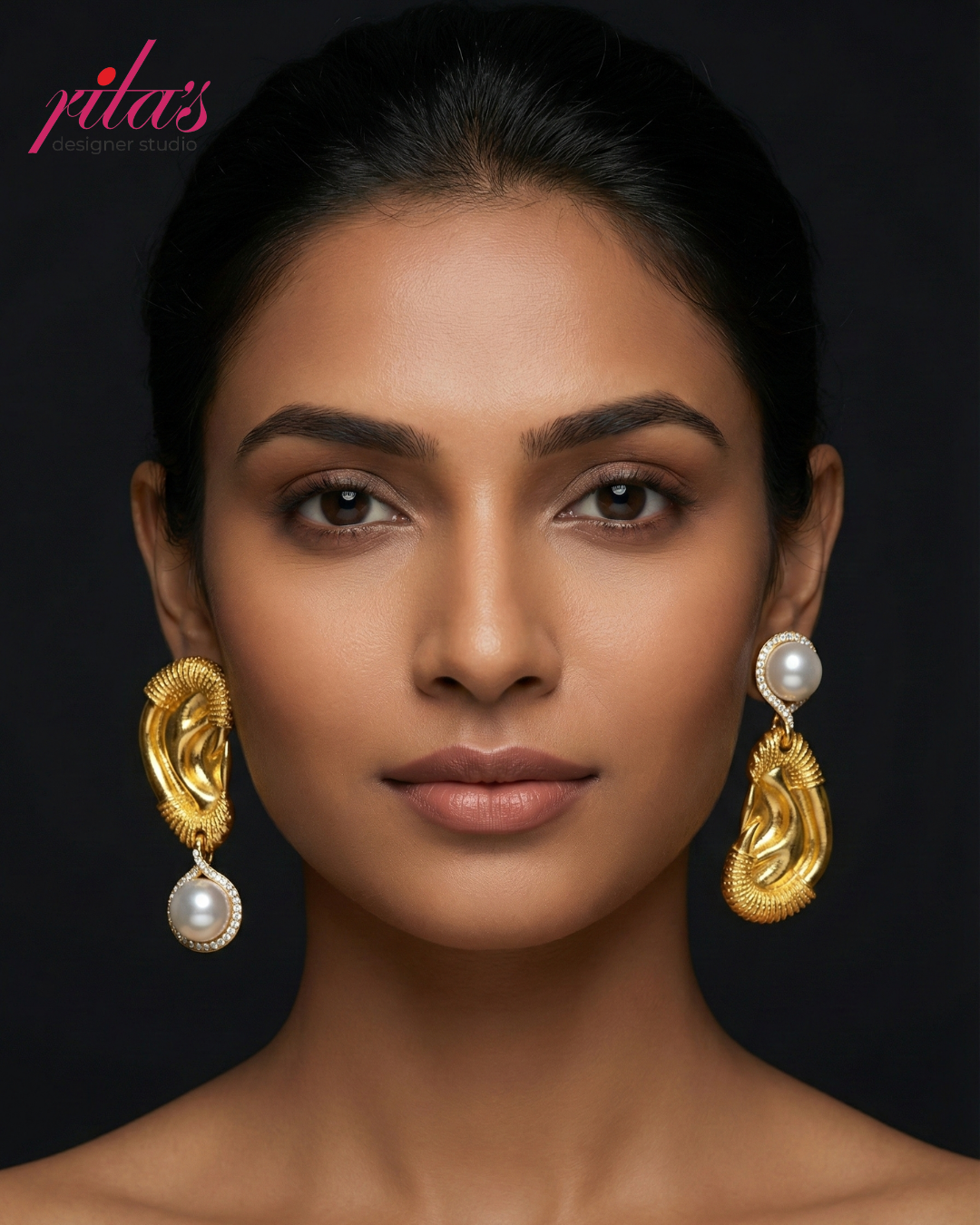 A pair of mismatched statement earrings featuring sculptural, textured gold ears paired with large, halo-set pearls in an asymmetrical drop design.