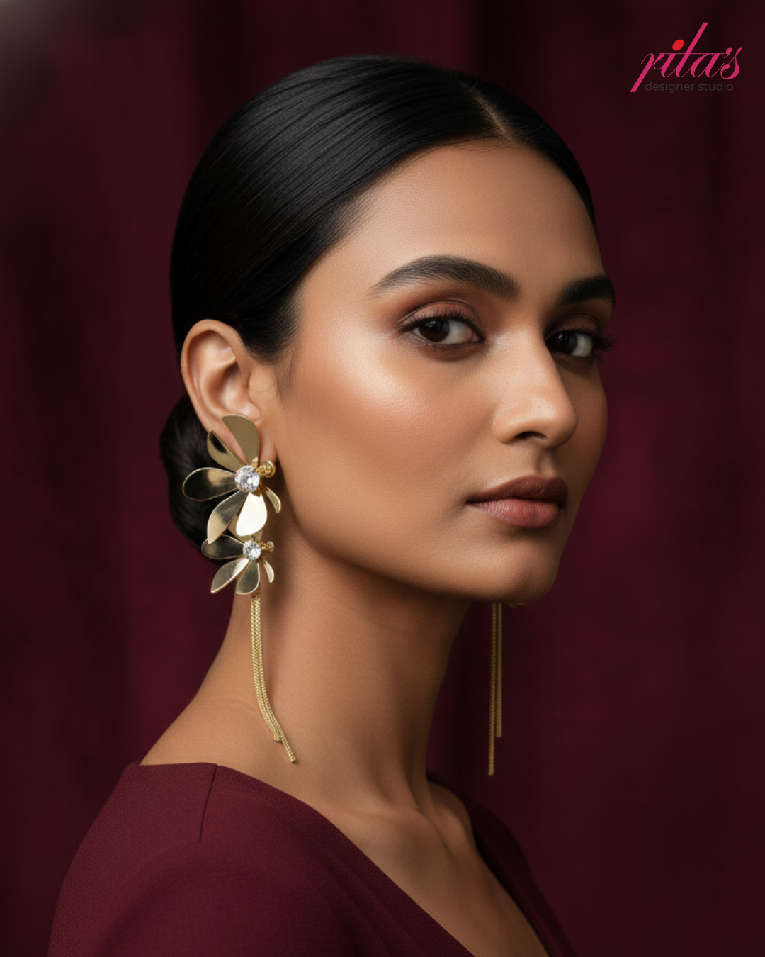 An ornate, gold-toned statement earring featuring a crescent-topped circular medallion with colorful inlays, three green teardrop stones, and long, delicate beaded tassels ending in a small jhumka bell.