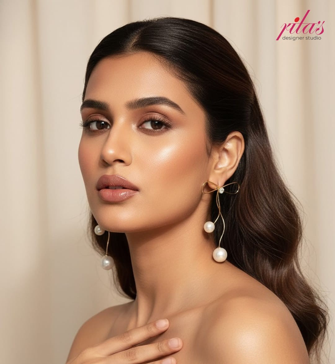 These elegant, modern drop earrings feature a delicate gold-toned bow stud centered with a shimmering crystal, from which two slender, curved gold wires dangle to hold luminous pearl accents of varying sizes.
