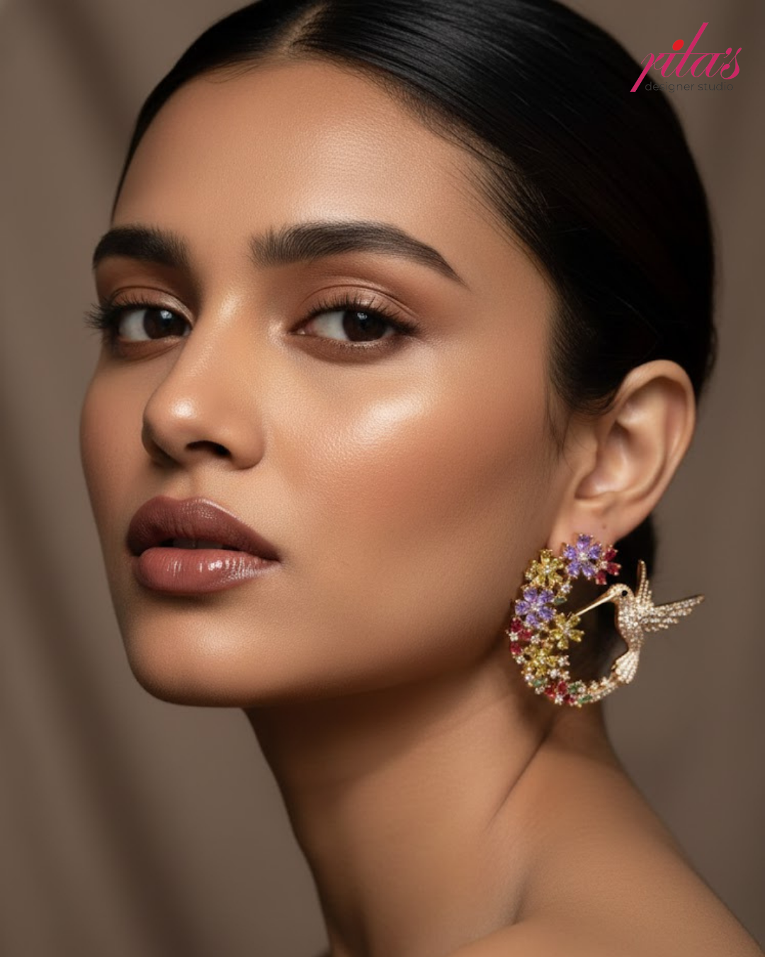 A vibrant and whimsical design, these circular earrings feature a hummingbird motif in mid-flight, encrusted with crystals and surrounded by a wreath of multicolored floral accents in purple, yellow, and pink hues