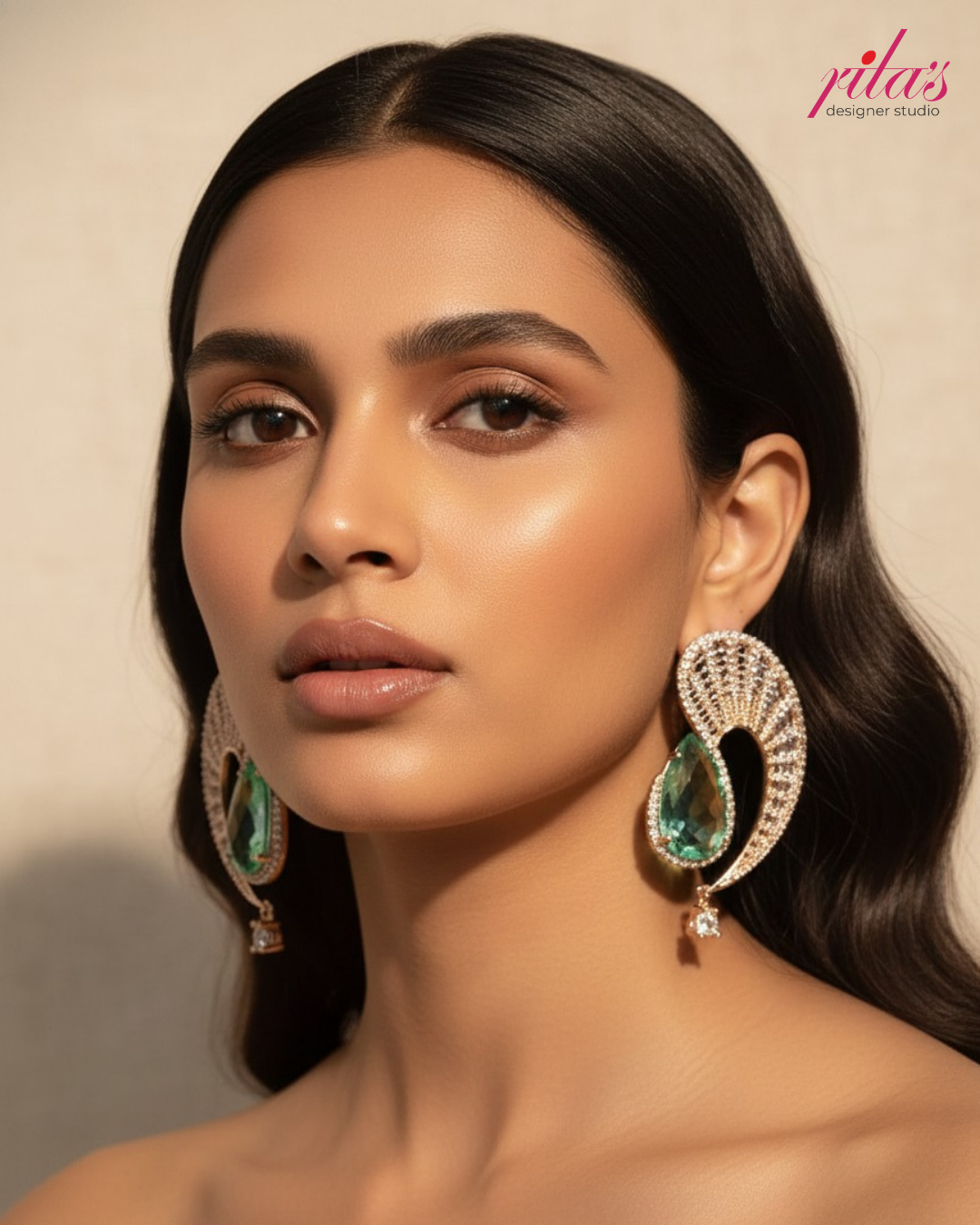 An ornate, gold-toned statement earring featuring a crescent-topped circular medallion with colorful stone inlays, three green teardrop stones at the stud, and long, delicate beaded tassels ending in a small jhumka bell.