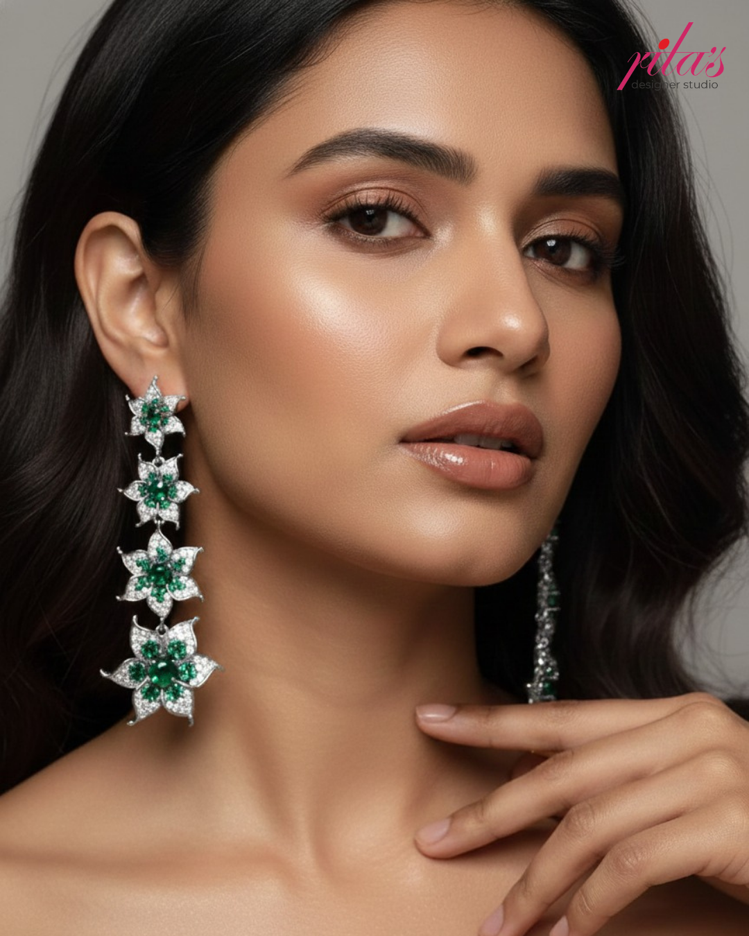 FLORAL WHITE GREEN STONE WORK DROP EARRING