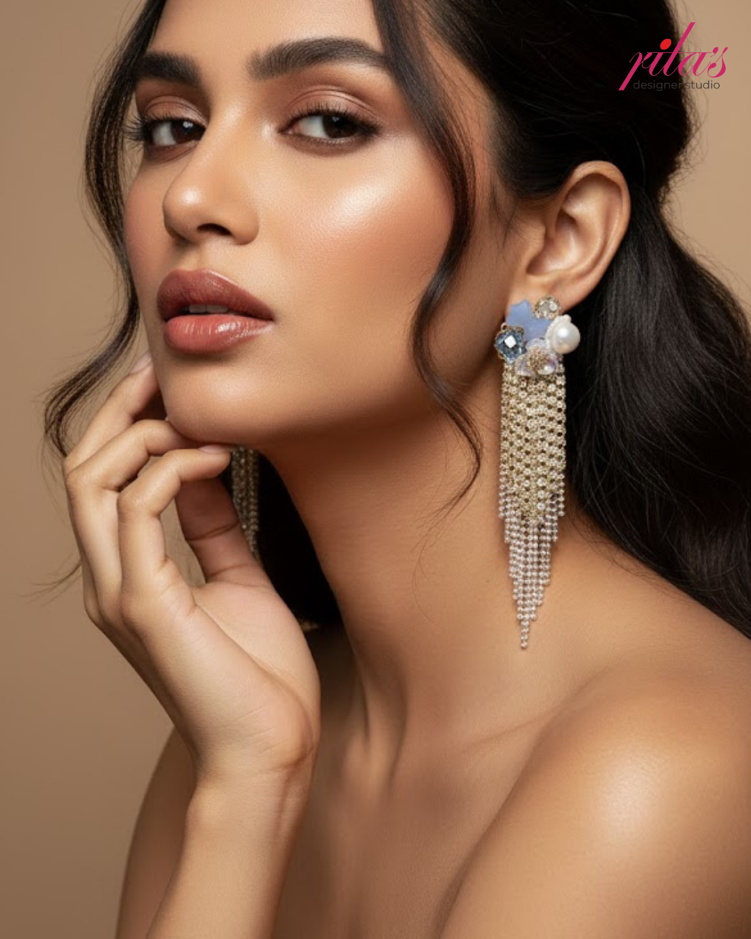 Sophisticated shoulder-dusting earrings showcasing a cluster of blue and clear crystals with a large pearl, finished with a long, tapering mesh of delicate metallic beads.