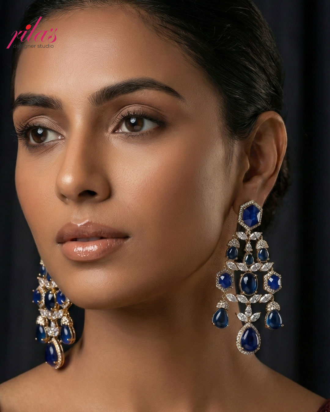 Ornate chandelier earrings featuring deep blue sapphire-colored gemstones in various cuts, accented by intricate diamond-style detailing in a gold-toned setting.