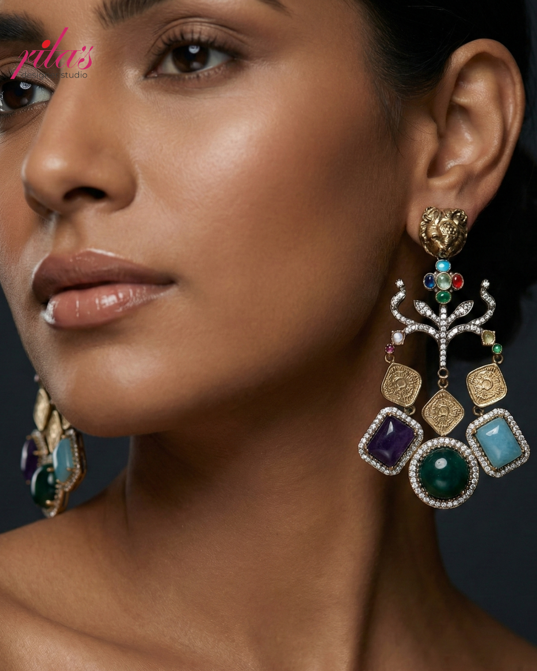 These bohemian-inspired statement earrings feature a gold lion-head stud, an intricate diamond-accented branch, and a vibrant mix of colorful cabochon gemstones and antique-style gold coins.