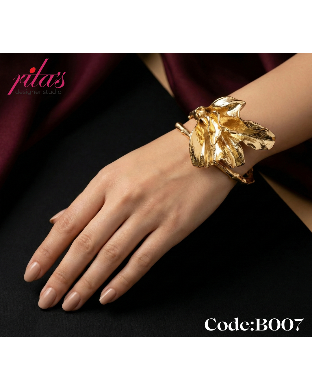 A gold-toned, floral-motif cuff bracelet featuring a large, sculpted flower on a textured branch-like band.
