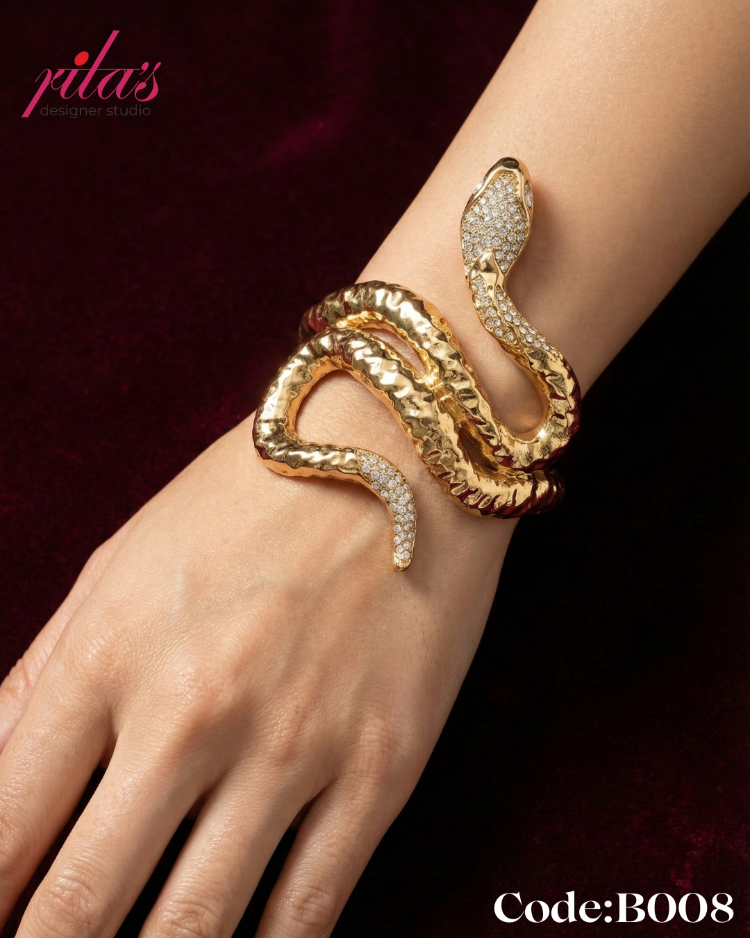 A bold, gold-toned wrap-around snake bracelet featuring a textured body and a head and tail embellished with shimmering crystals.